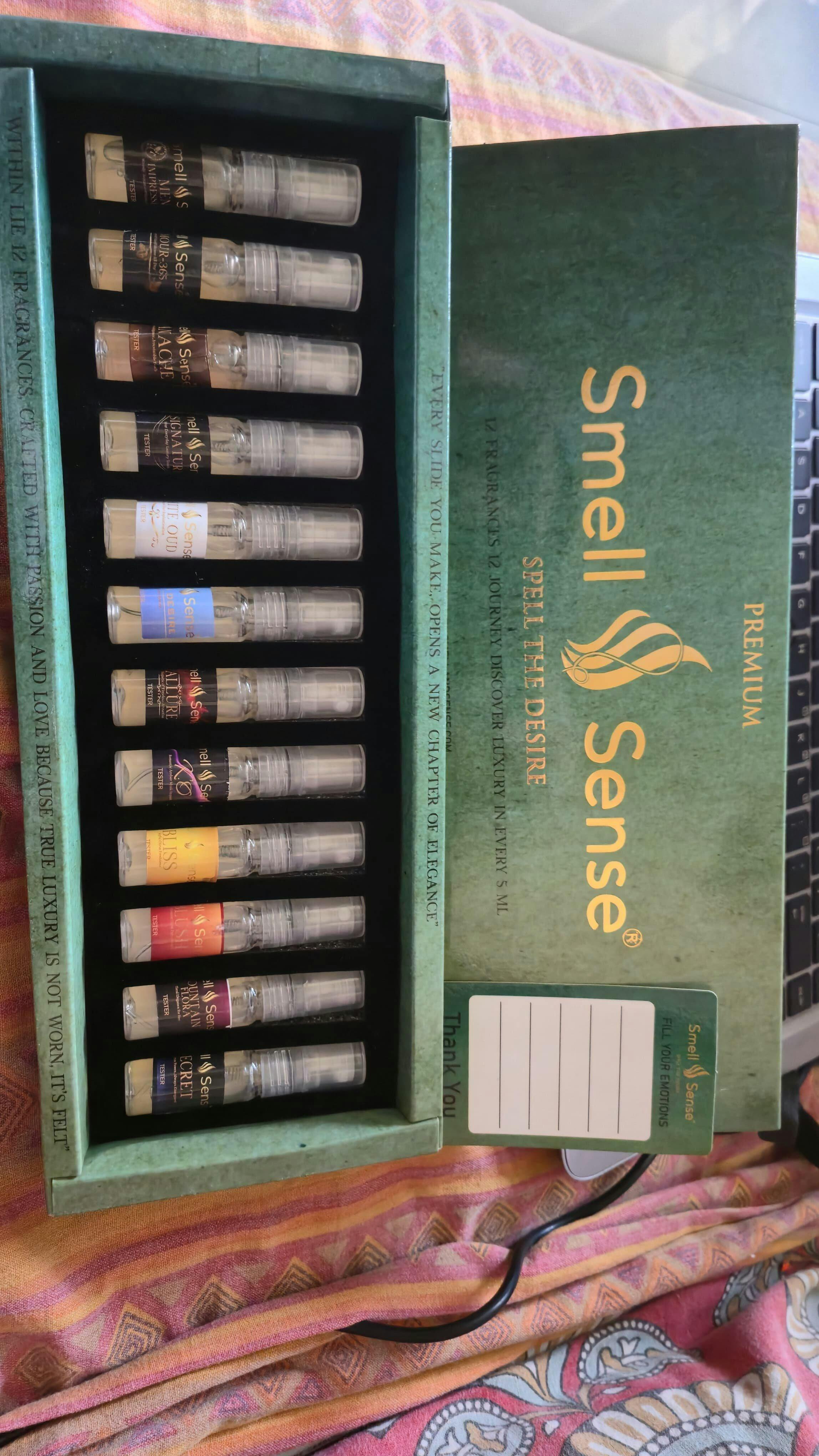I am the head of Eggos company. We have to give gift sets to our staff every Diwali. I saw that set in the ads and first of all I ordered a sample. Believe me guys, no one will give such a gift set for Rs 600. The quality of all the 12 fragrances is good and the biggest thing is that I have seen it often, but in these 12 fragrances, the fragrance of none of them is the same, all of them are different and amazing. Its packaging also gives a premium feel and the best thing about it is that they give a writing card along with it, which anyone can gift to their loved ones by expressing their emotions. This is an amazing idea. very good and best of luck smell & sense